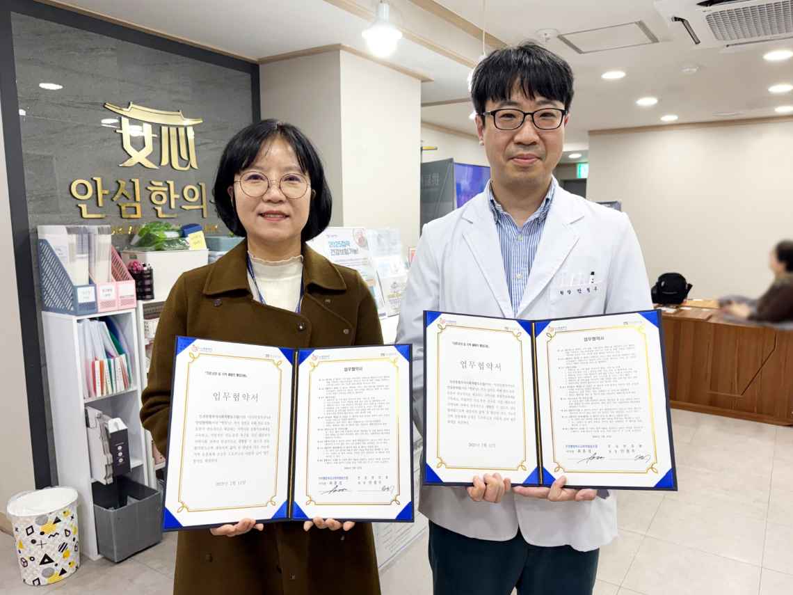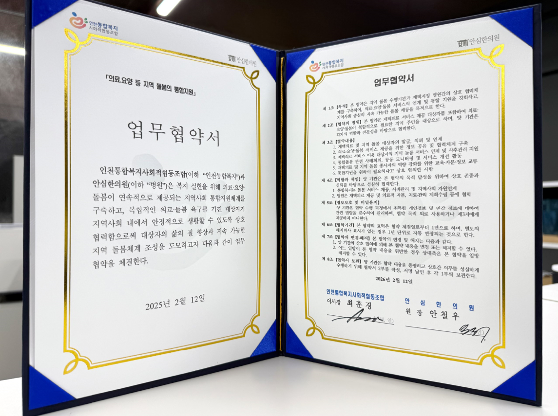 인천통합복지사회적협동조합(이사장 최훈경)이 2026년2월12일, 계양구 재택의료센터 안심한의원(원장 안철우)과 함께 의료·요양·돌봄의 경계를 허무는 '지역사회 통합지원체계' 구축을 위한 업무협약을 체결했다.