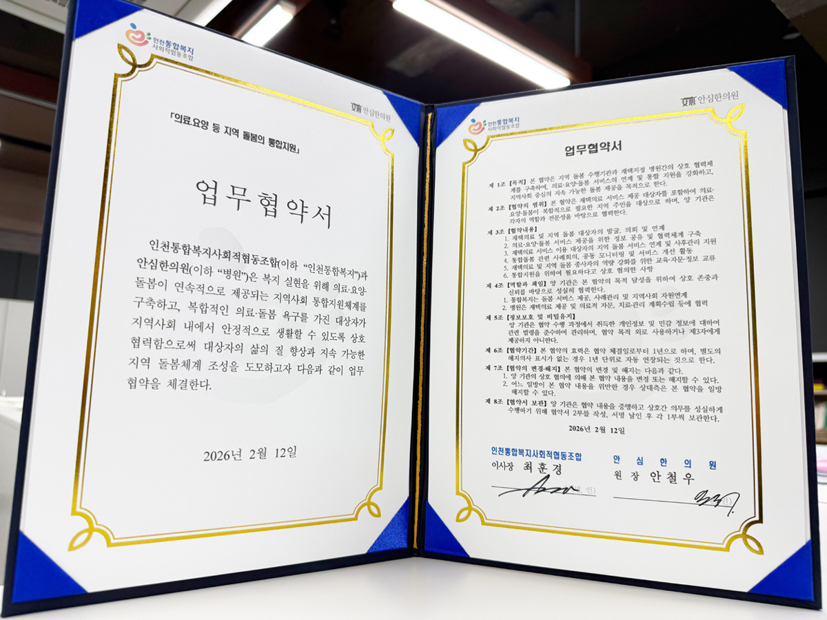 인천통합복지사회적협동조합(이사장 최훈경)이 2026년2월12일, 계양구 재택의료센터 안심한의원(원장 안철우)과 함께 의료·요양·돌봄의 경계를 허무는 '지역사회 통합지원체계' 구축을 위한 업무협약을 체결했다.