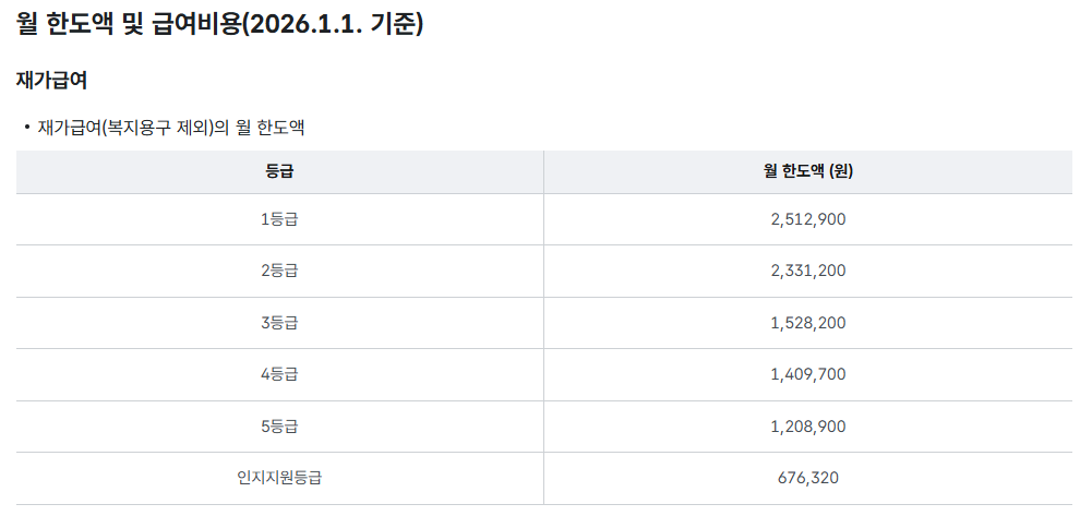 2026년 노인장기요양 월 한도액 및 급여비용 안내